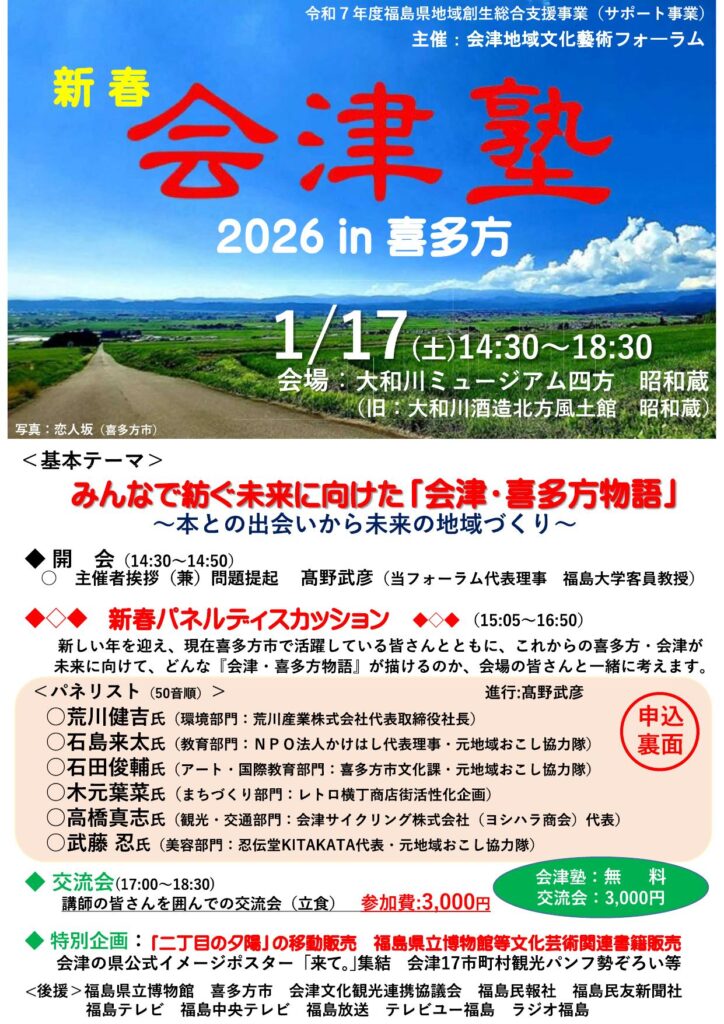 「新春会津塾 2026 in 喜多方」開催します!!